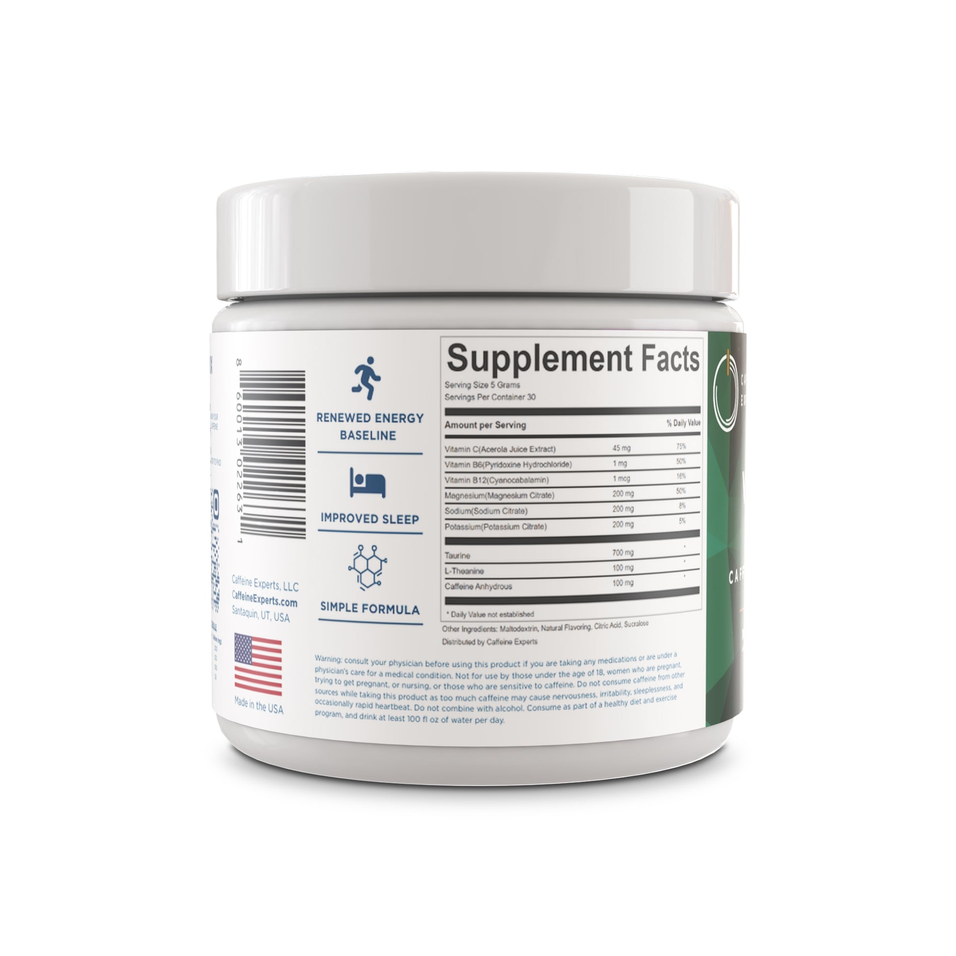 30 scoops. Each serving contains 200mg Sodium, 200mg Magnesium, 200mg Potassium, AND 100mg Caffeine, 700mg Taurine, 100mg L-Theanine, 45mg Vitamin C, 1.2mg Vitamin B6, and 1.4mcg Vitamin B12.