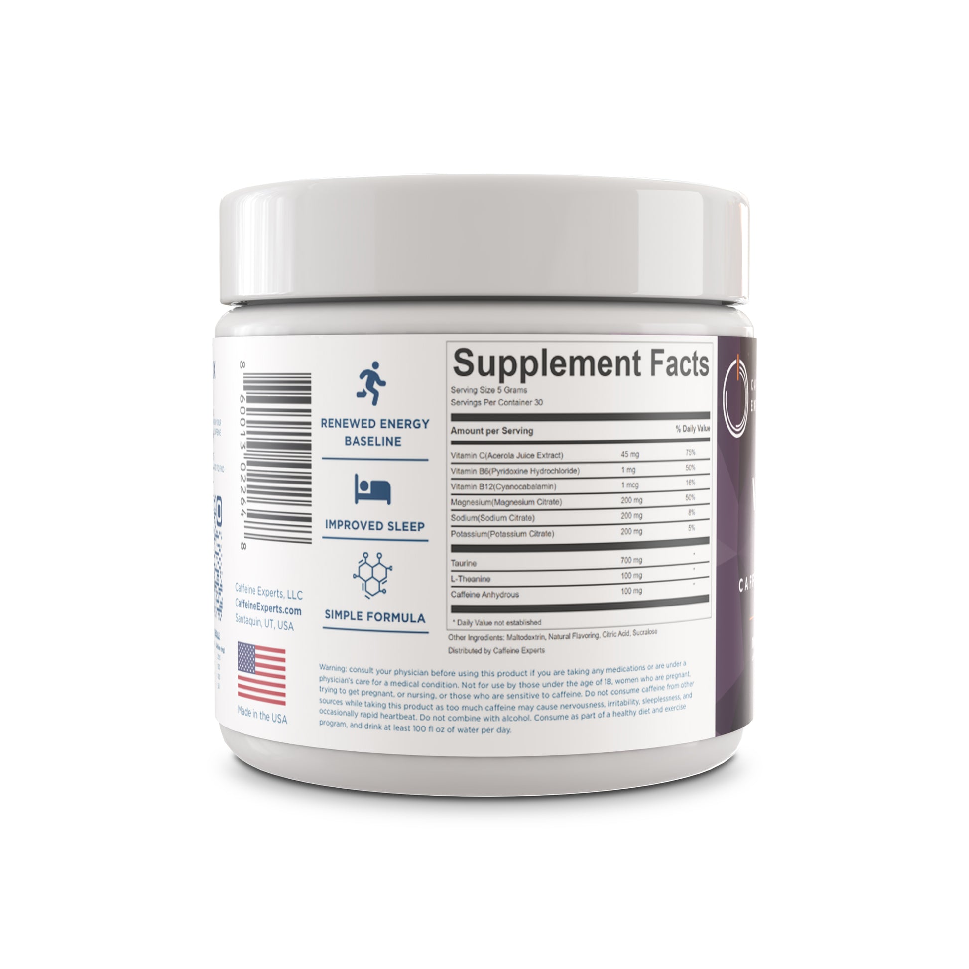 30 scoops. Each serving contains 200mg Sodium, 200mg Magnesium, 200mg Potassium, AND 100mg Caffeine, 700mg Taurine, 100mg L-Theanine, 45mg Vitamin C, 1.2mg Vitamin B6, and 1.4mcg Vitamin B12.